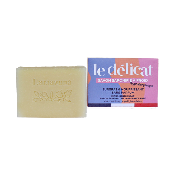 Saponifié à froid, le savon Délicat nettoie en douceur grâce à ses trois huiles aux propriétés préservées et assure une